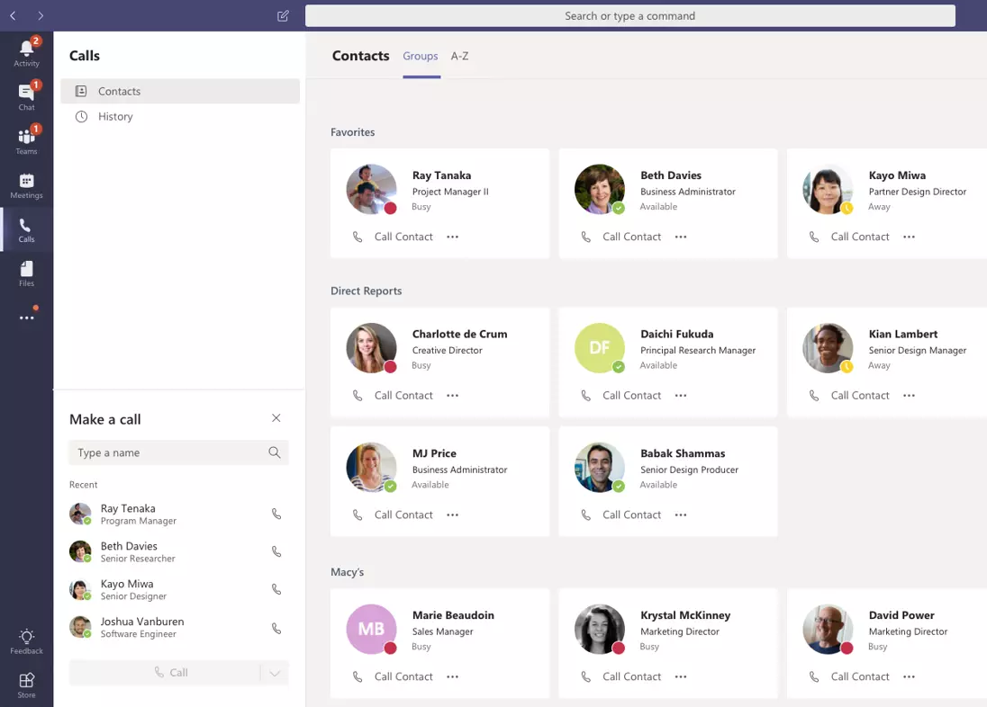 Virtuelle Meetings bieten alle Vorteile für produktive Teamarbeit. Dazu gehören Videokonferenzen, Teilen von Inhalten und Dateien, digitale Whiteboards, Notizen und Chat Funktion Meetings könne spontan oder geplant aufgesetzt werden - egal ob im kleinen Rahmen oder mit großer Teilnehmerzahl Microsoft Teams bietet die Möglichkeit, Ihre gesamte Telefonie darüber abzuwickeln. Dazu gehören Funktionen wie Gruppenanrufe, Vertreternummern, Mailboxen und weitere Features, wie Sie es von Telefonanlagen gewohnt sind.