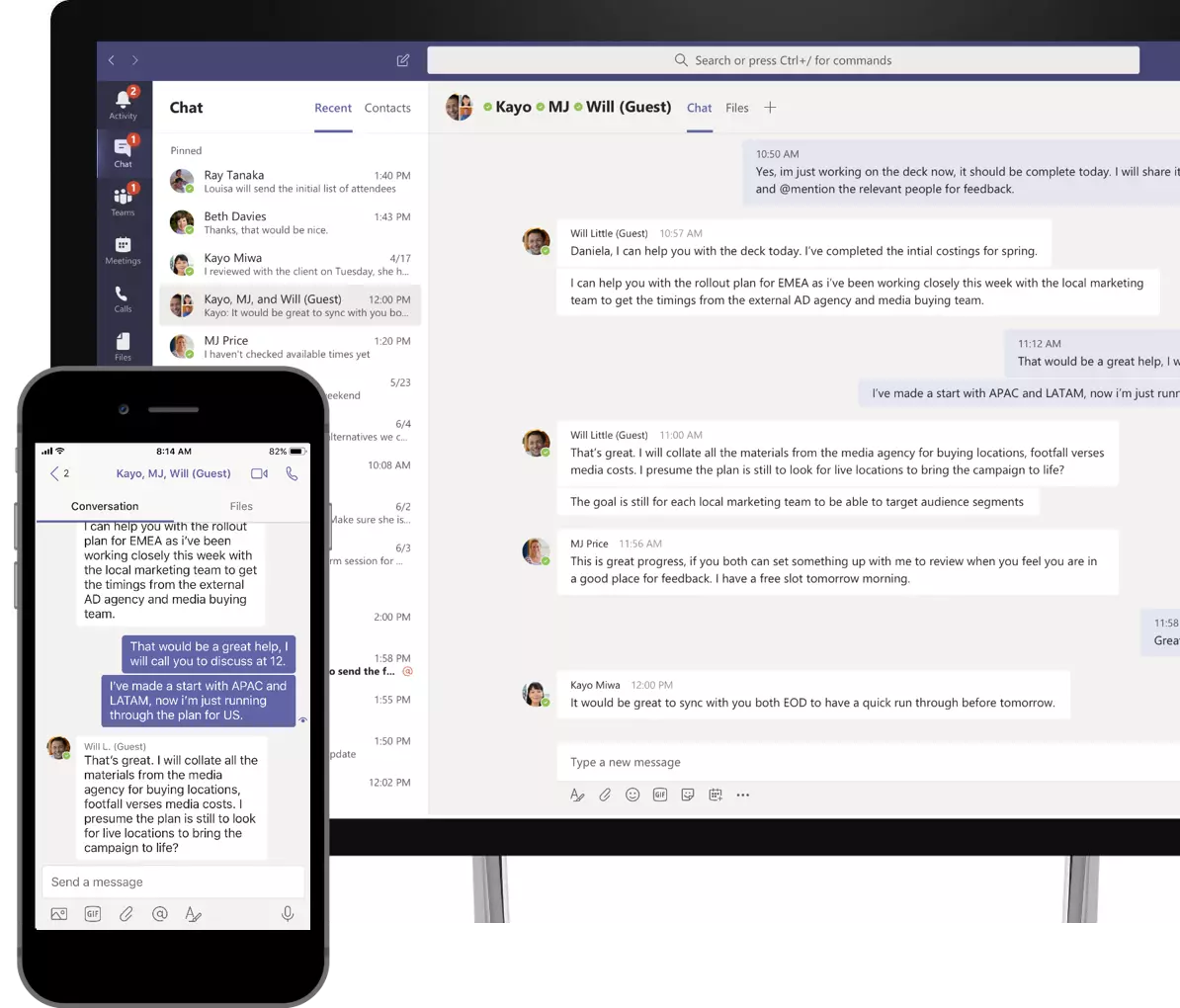 In Teams nutzen Sie die besten Funktionen von Office 365 wie beispielsweise die gemeinsame Zusammenarbeit an Dateien - direkt aus Teams heraus. Sie müssen nicht ständig zwischen Software hin- und her wechseln. SharePoint, OneNote, Power BI, Planner, Power Automate und PowerApps sind direkt verknüpft. Besser noch: Mit nur einem Klick fügen Sie Gruppen und Kanälen weitere Apps von Drittanbietern hinzu, beispielsweise zur Projektplanung, Umfragen, Websites, u.v.m. Durch Aktivitäten- und Informationsverteilung halten Sie Ihr Team stets auf dem Laufenden über Neuigkeiten und Änderungen.